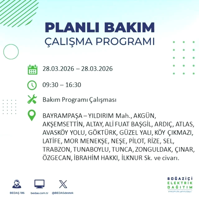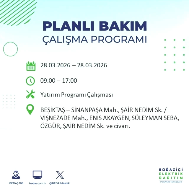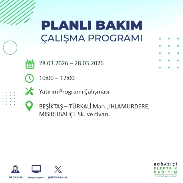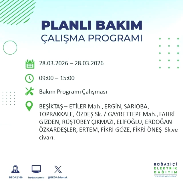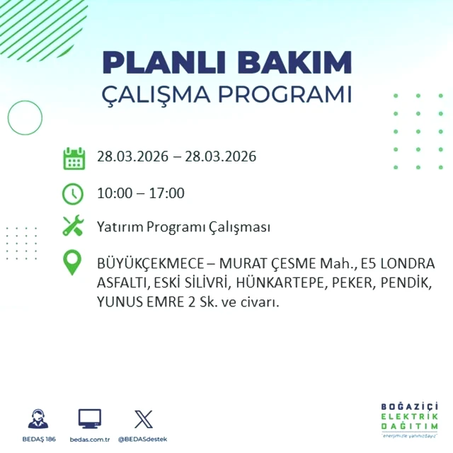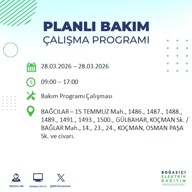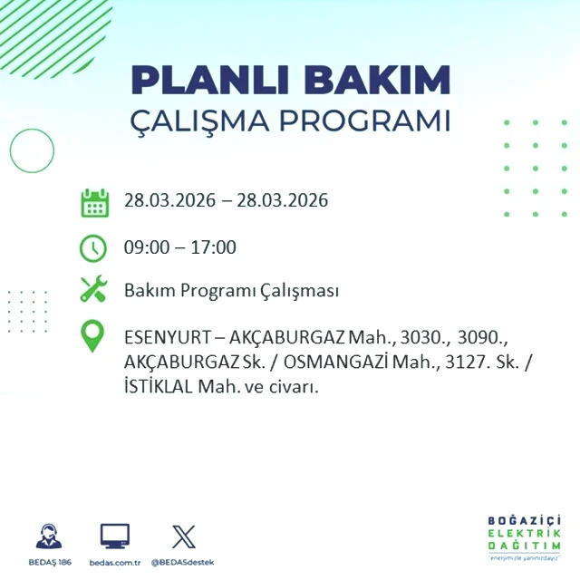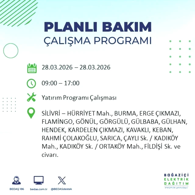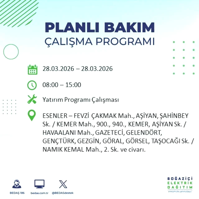 Boğaziçi Elektrik Dağıtım A.Ş tarafından yapılan açıklamaya göre, 28 Mart Cumartesi günü İstanbul'da belirli saat dilimlerinde elektrik kesintileri uygulanacak.