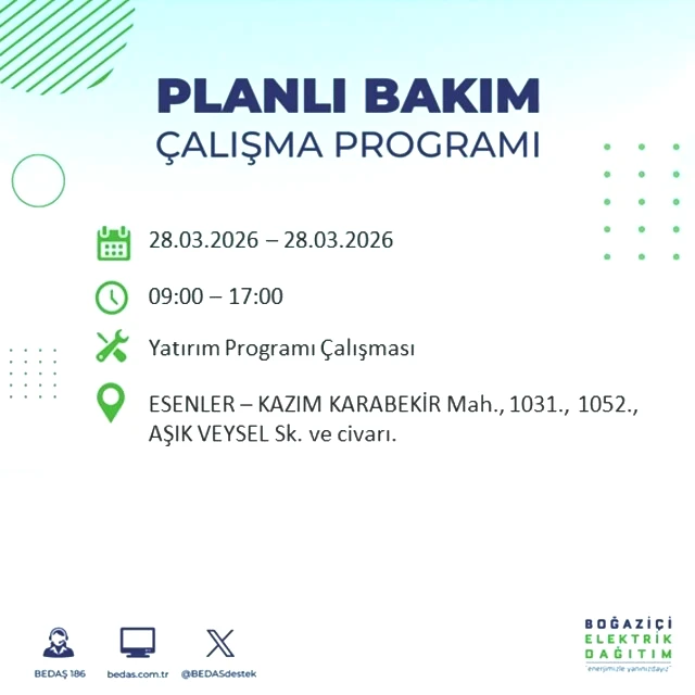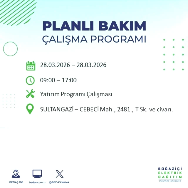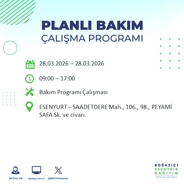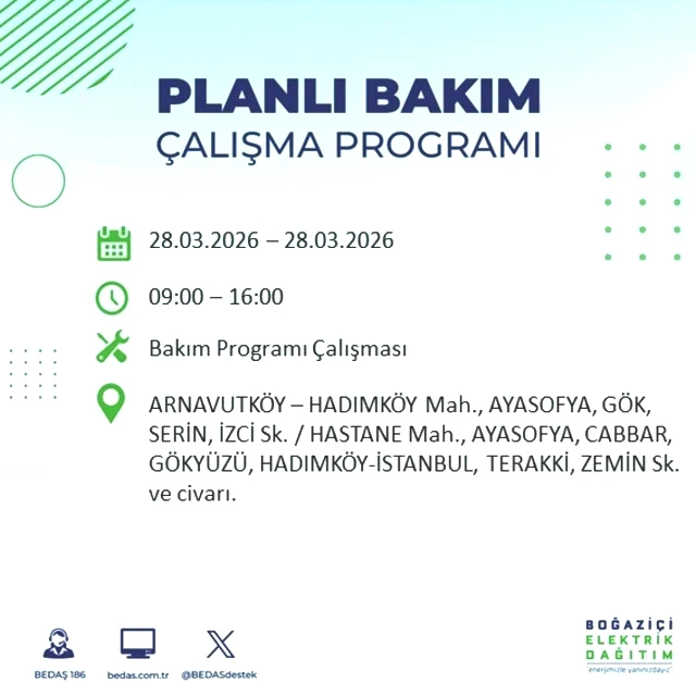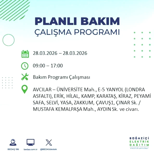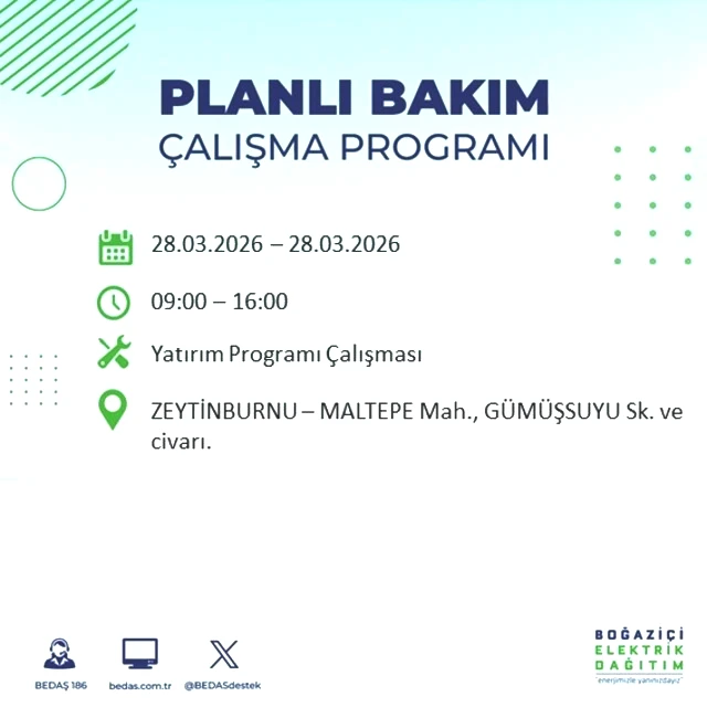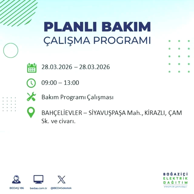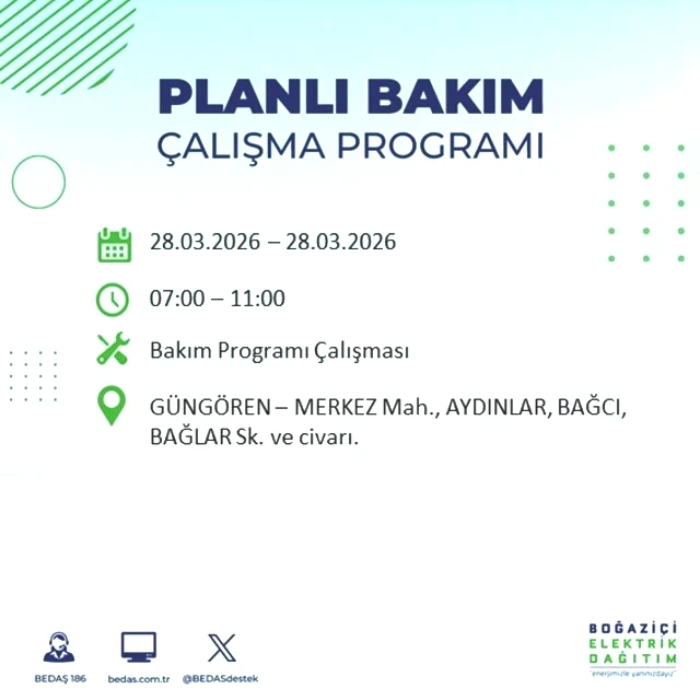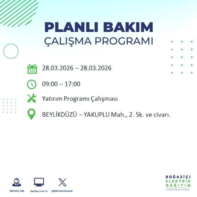 Boğaziçi Elektrik Dağıtım A.Ş tarafından yapılan açıklamaya göre, 28 Mart Cumartesi günü İstanbul'da belirli saat dilimlerinde elektrik kesintileri uygulanacak.